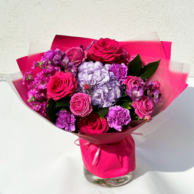 Этот букет в яркой палитре фиолетовых и розовых оттенков создаёт атмосферу нежности и радости. В составе: фиолетовая гортензия, розовая одноголовая роза, сиреневая гвоздика, альстромерия и маттиола. Упаковка выполнена в матовой плёнке с розовой лентой. Композиция идеально подойдёт для поздравления друга на День Святого Валентина.