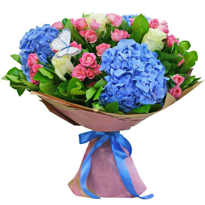 Яркие голубые и розовые оттенки наполняют атмосферу нежностью, благодаря сочетанию синей гортензии и розовой кустовой розы, дополненной белой одноголовой розой и зеленью. Упакован в крафт-бумагу с матовой плёнкой и украшен голубой лентой. Композиция создаёт атмосферу лёгкости и радости. Подойдёт для долгожданной встречи для любимой женщины.