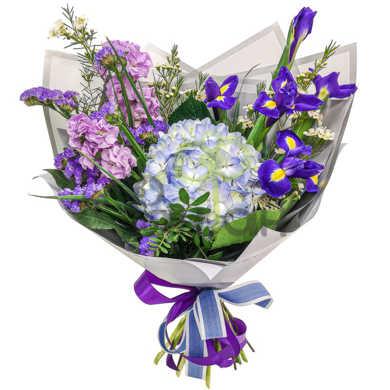 Яркие фиолетовые и белые оттенки вносят радость и свежесть. В составе букета ваксфлауэр, ирис, гортензия, статица, маттиола и зелень. Упакован в матовую пленку с декором из атласной ленты. Создаёт атмосферу нежности и романтики. Идеально для поздравления подруги на День Святого Валентина.