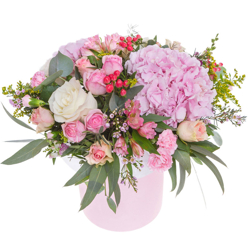 Этот букет вызывает ощущение нежности благодаря розовой цветовой гамме. В составе: розовая гортензия, розовая кустовая роза, белая одноголовая роза, розовая альстромерия, мини розовая гвоздика, ваксфлауэр, гиперикум, солидаго и эвкалипт. Упакован в элегантную шляпную коробку розового цвета. Создаёт атмосферу романтики и утончённости. Порадует любимую женщину на годовщину.