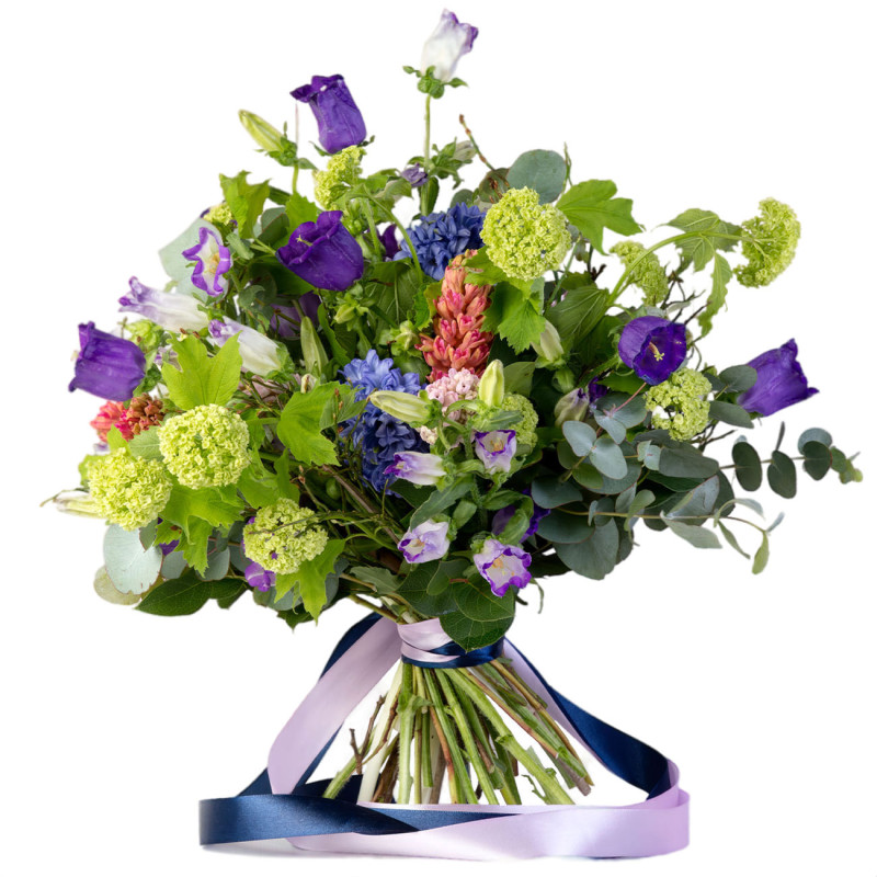 Свежие оттенки зелёного вибурнума и яркие фиолетовые колокольчики создают атмосферу весеннего настроения. В составе букета — колокольчик, вибурнум зеленый, разноцветный гиацинт и эвкалипт. Упакован в матовую пленку, дополненную декоративной сеткой и перевязанную атласной лентой. Этот букет подарит радость на юбилей для мамы.