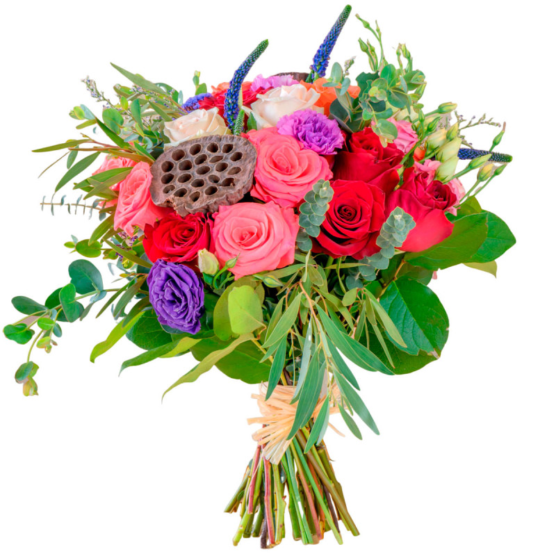 Роза одноголовая розовая, белая и красная, эустома фиолетовая, гвоздика сиреневая, вероника, эвкалипт, лотос, зелень. Упаковка (лента, пленка, крафт, сетка, пленка матовая)