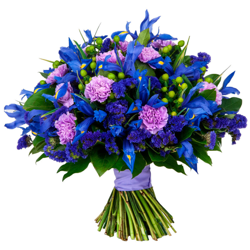 Гвоздика сиреневая, ирис синий, гиперикум, статица синяя, зелень. Упаковка (лента, пленка, крафт, сетка, пленка матовая)