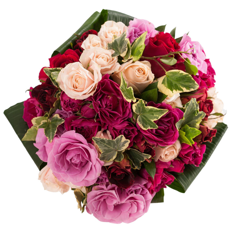 Роза одноголовая розовая, роза кустовая кремовая, розовая и красная, аспидистра, плющ. Упаковка (лента, пленка, крафт, сетка, пленка матовая)