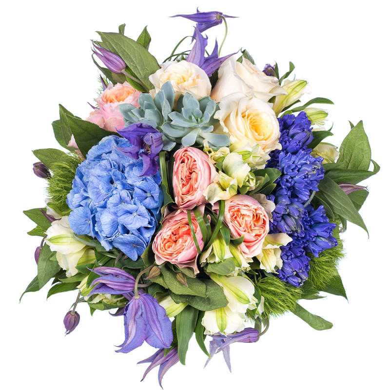 Гортензия синяя, роза одноголовая розовая, альстромерия белая, клематис, суккулент, зелень. Упаковка (лента, пленка, крафт, сетка, пленка матовая)