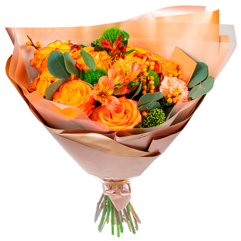 Яркие оранжевые оттенки букета вызывают радость и тепло. В составе: роза одноголовая оранжевая, альстромерия оранжевая, кремовая гвоздика, гиперикум, эвкалипт и зелень. Упакован в матовую плёнку, аккуратно дополненную нежной лентой. Этот букет создаёт атмосферу счастья и прекрасно подходит на премию для коллеги.