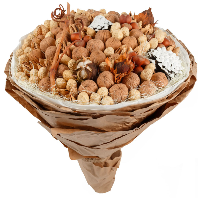Теплая палитра натуральных орехов создаёт уютное ощущение. В составе грецкие орехи, арахис, миндаль, фундук, хлопок и декоративные ветки. Упакован в крафт-бумагу, что придает букету естественность и стиль. Этот букет создаёт атмосферу домашнего уюта и идеально подойдёт для благодарности врачу.