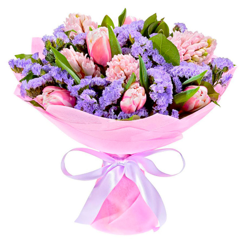 Этот нежный букет в розово-сиреневой гамме создаёт атмосферу лёгкости и романтики. В составе букета розовые тюльпаны, розовые гиацинты, лимониум и зелень. Упакован в матовую розовую плёнку и перевязан атласной лентой. Идеально подойдёт для новоселья, чтобы порадовать молодожёнов.