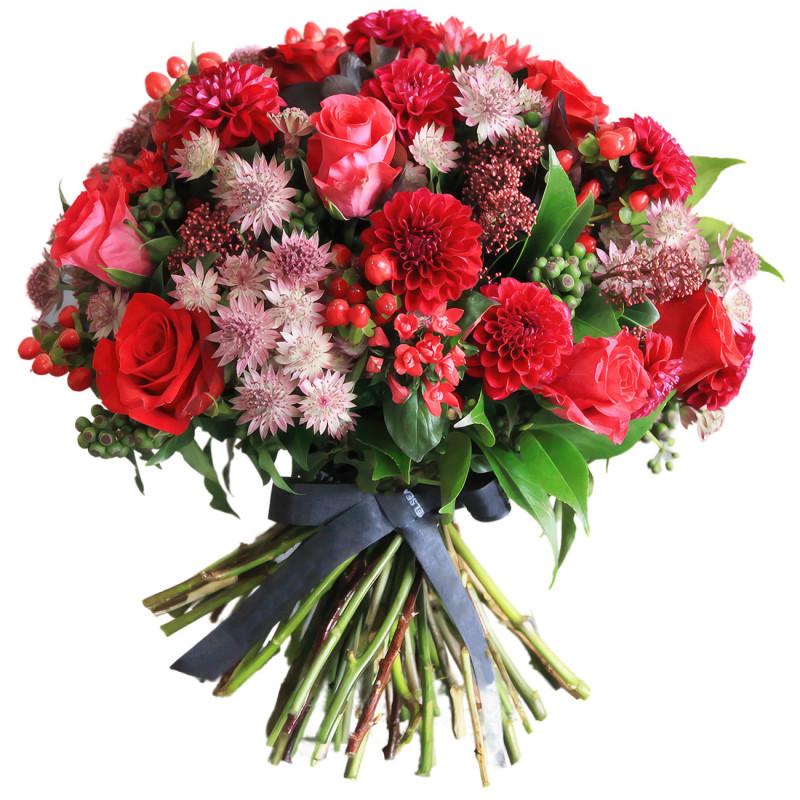Яркие красные и розовые оттенки в этом букете создают атмосферу страсти и нежности. В составе георгина красная, роза одноголовая красная и розовая, астранция, гиперикум и салал. Букет оформлен с тёмной лентой, добавляющей элегантности. Он подойдёт для романтического вечера для любимой.
