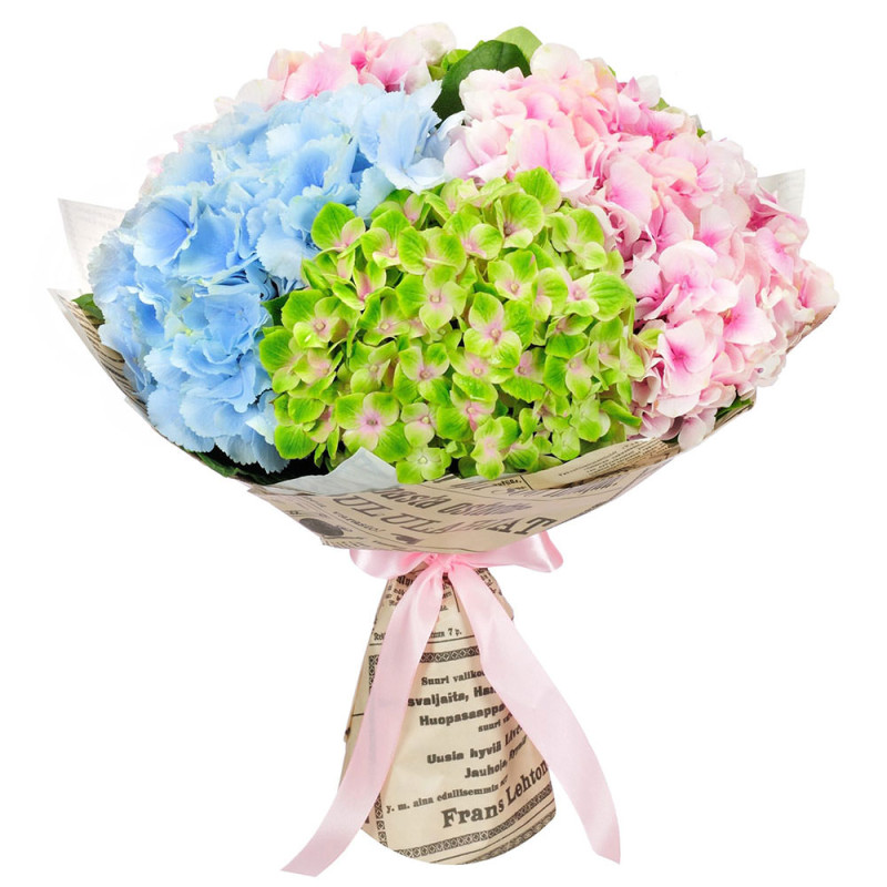 Этот букет вызывает чувство свежести и лёгкости благодаря сочетанию розовой, зеленой и голубой гортензии. Нежные оттенки цветов создают атмосферу умиротворения и гармонии. Букет в крафт бумаге с надписями и украшен простой лентой, которая подчеркивает его естественную красоту. Он станет отличным подарком для преподавателя на День знаний, добавив нотку элегантности и изысканности в праздничный день.