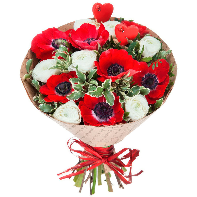 Яркие алые тона и нежные белые оттенки создают захватывающую палитру. В составе мак, ранункулюс мини белый и зелень. Букет оформлен в крафт-бумагу с красной атласной лентой, добавляющей элегантности. Эта композиция создаёт атмосферу любви и тепла. Идеально для подарка на День Святого Валентина для любимой женщины.