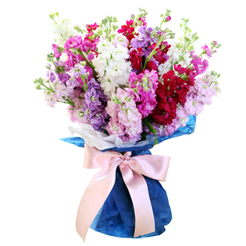 Яркие оттенки розовой, белой, красной и фиолетовой маттиолы создают атмосферу радости и веселья. Цветы аккуратно собраны в букет, завёрнутый в синюю бумагу с нежной розовой атласной лентой. Композиция наполняет пространство свежестью и гармонией. Идеально подойдёт для романтического вечера для любимого.