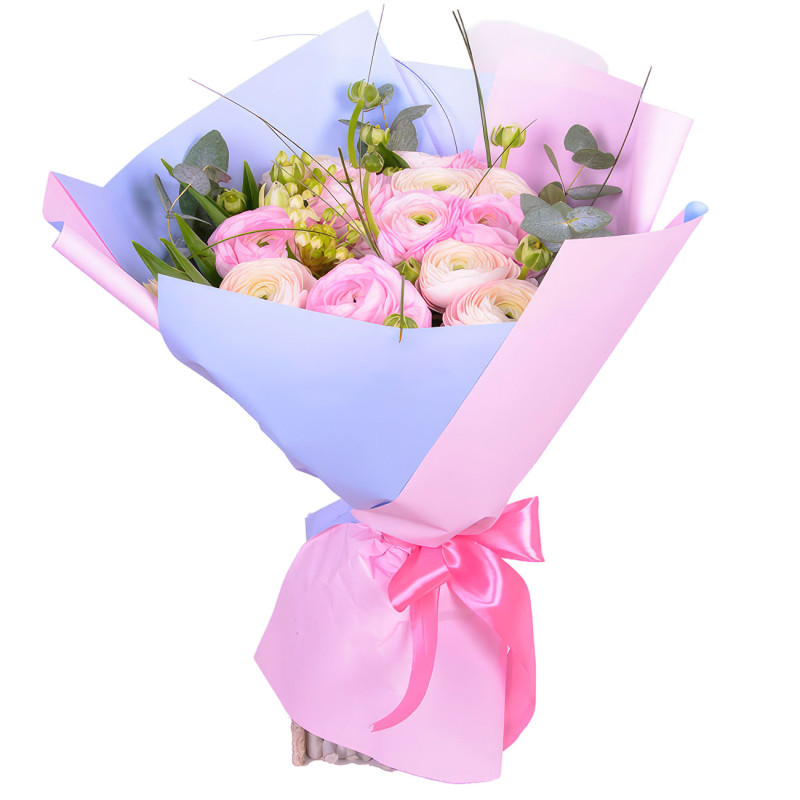 Этот букет поражает мягкой розовой палитрой, создавая атмосферу нежности и романтики. В композиции использованы розовые ранункулюсы и эвкалипт. Упакован в стильную матовую плёнку нежно-голубого и розового оттенка, с украшением из атласной розовой ленты. Такой букет идеально подойдёт на День семьи, любви и верности для вашей любимой женщины.