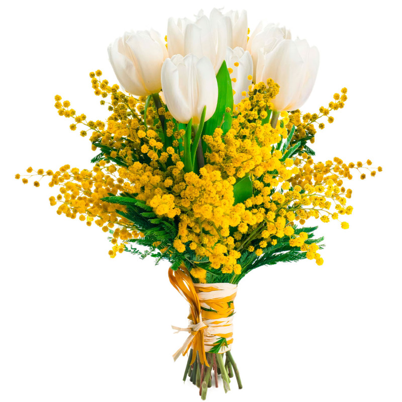 Яркий жёлтый и нежный белый создают атмосферу свежести и радости. В составе букета — мимоза, белый тюльпан и зелень. Упаковка представлена в виде изящной ленты, которая подчёркивает естественную красоту цветов. Идеально подходит для поздравления мамы на День матери.
