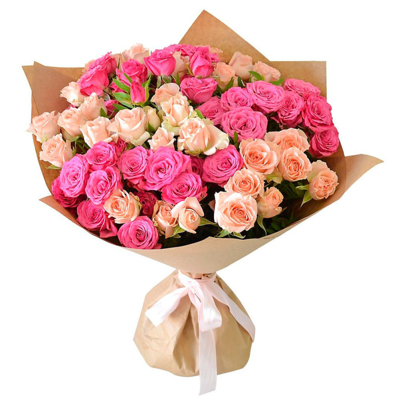 Этот букет из кремовых и розовых кустовых роз создает атмосферу нежности и утончённости. Цветы аккуратно завёрнуты в крафт-бумагу и декорированы белой атласной лентой. Композиция дарит ощущение праздника и гармонии. Идеально подойдёт для поздравления девушки на День Святого Валентина.