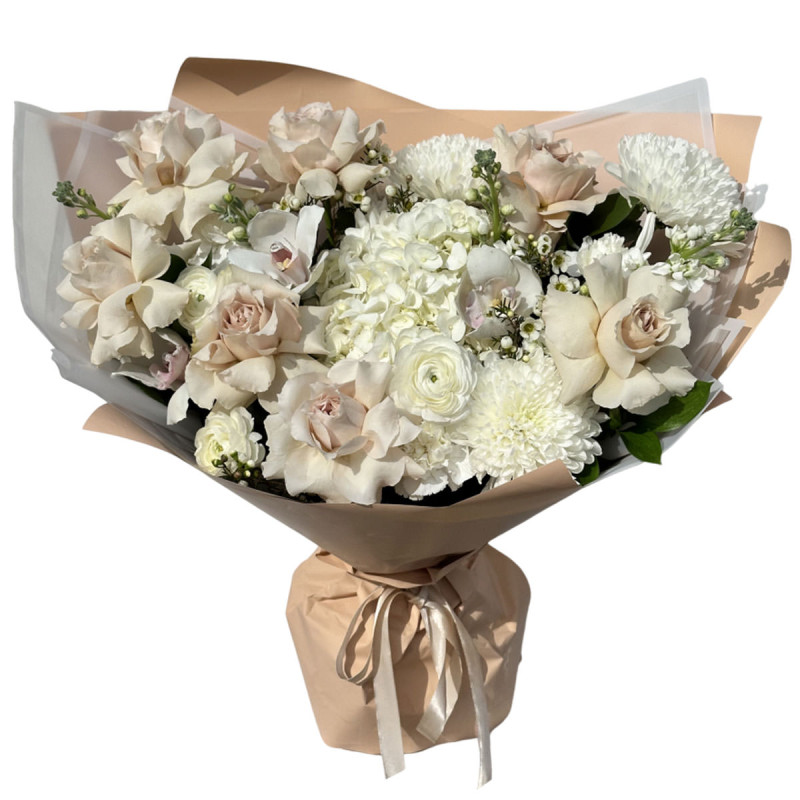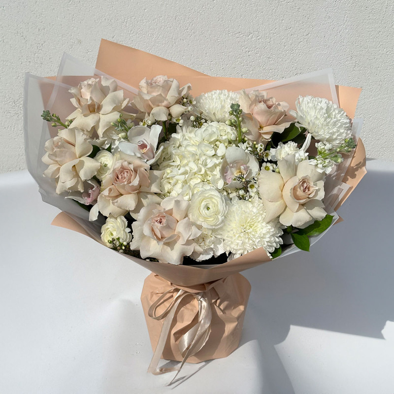 Элегантная бело-кремовая палитра букета создаёт атмосферу нежности и утончённости. В его составе роскошные французские капучино розы, белоснежные хризантемы, гортензии, ранункулюсы, орхидеи и ваксфлауер. Букет оформлен в матовую пленку и крафт-бумагу, перевязанную атласной лентой. Композиция станет отличным подарком для молодожёнов на свадьбу и порадует невесту своей изысканностью.