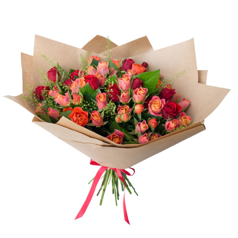 Яркие розовые, бордовые и оранжевые розы в сочетании с нежным тласпи и сочным салалом создают красочную палитру. Букет оформлен в крафт-бумагу и перевязан красной лентой. Эта композиция приносит атмосферу тепла и радости. Прекрасный подарок для любимой женщины на День матери.