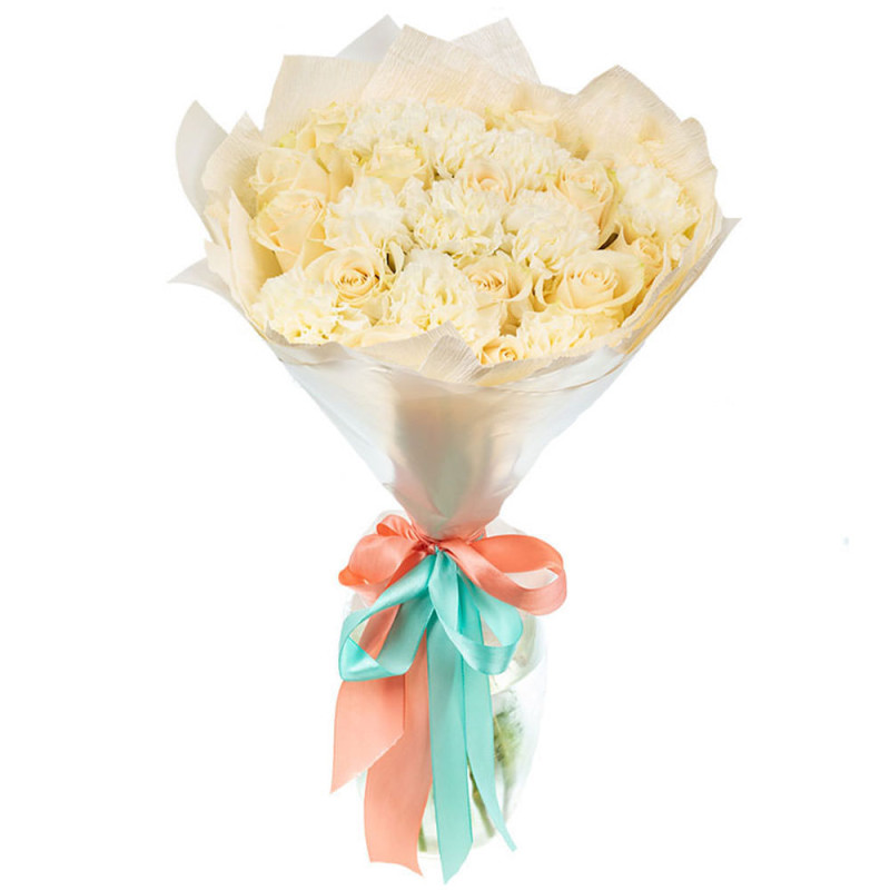 Этот букет в белоснежной цветовой гамме придаёт ощущение чистоты и утончённости. В составе белые розы и гвоздики, которые гармонично дополняют друг друга. Упакован в матовую плёнку и украшен цветной лентой, которая добавляет изысканности. Создаёт романтическую атмосферу. Идеально подойдёт для поздравления коллеги с повышением.
