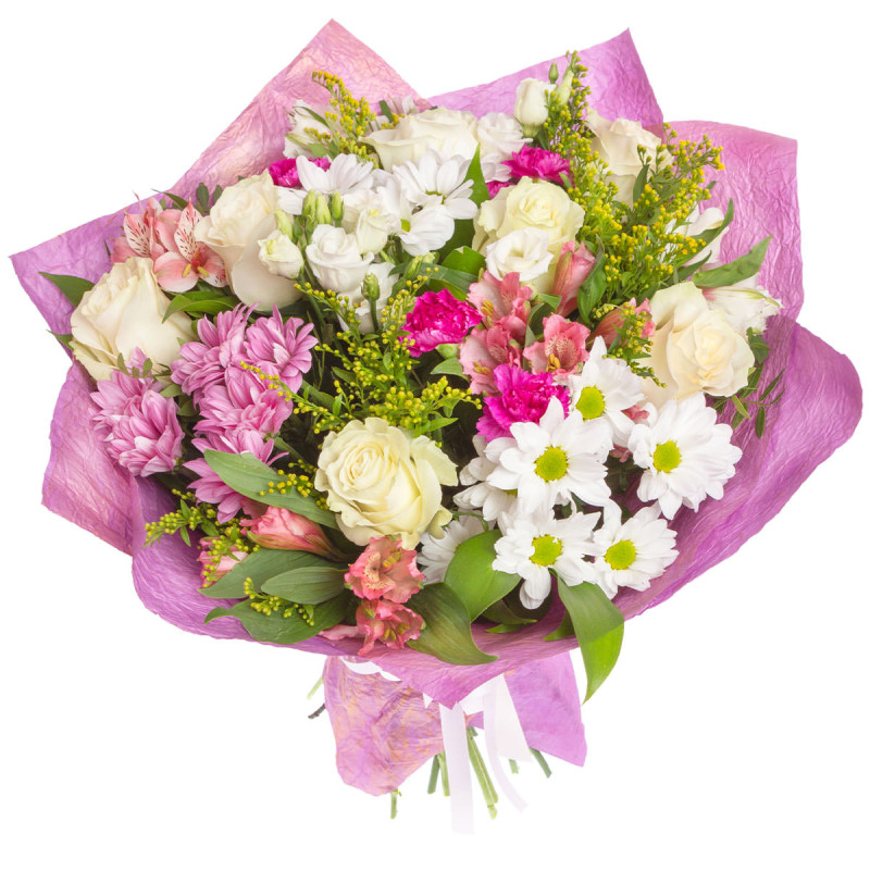 Этот букет очаровывает нежной розовой и белой палитрой, создавая атмосферу легкости и утонченности. В составе композиции розовые и белые кустовые хризантемы, белая одноголовая роза, розовая альстромерия и солидаго. Упакован в яркую розовую бумагу, подчёркивающую его романтичный характер. Подойдет для романтического вечера для любимой женщины, создавая незабываемую атмосферу.