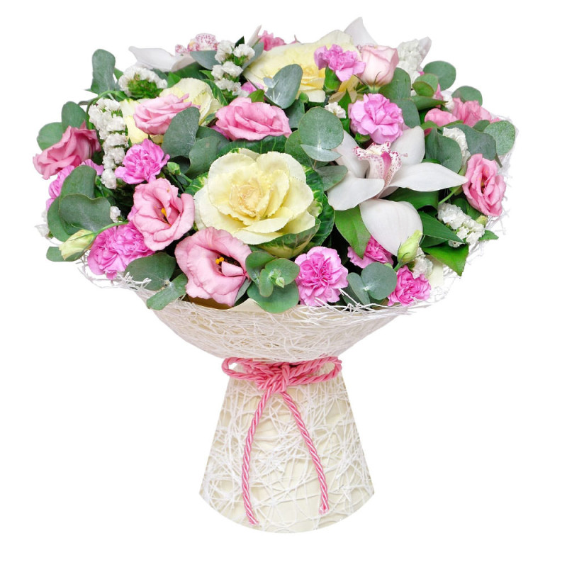 Романтический букет в нежно-розовых и белых тонах, который включает эустому розовую, кустовую мини-гвоздику розовую, орхидею белую, брассику, статицу белую и эвкалипт. Композиция обернута в стильную флористическую сетку с акцентом на нежно-розовую ленту. Этот букет создаёт атмосферу легкости и изящества, идеален для романтического вечера для любимой женщины.