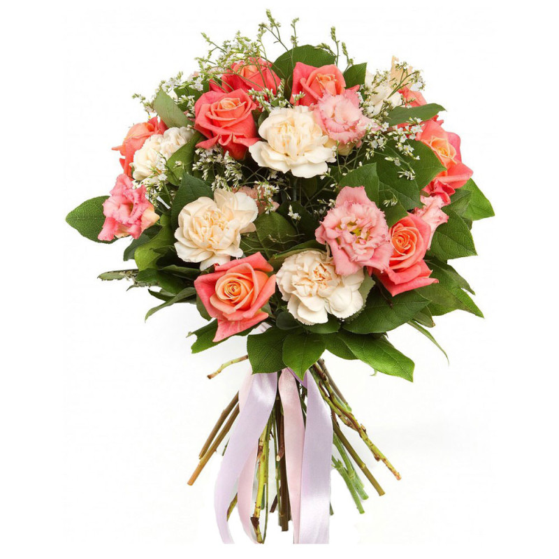 Этот букет излучает нежность и романтику благодаря розово-персиковым розам, кремовым гвоздикам и розовым эустомам, дополненным зеленью. Упакован в матовую плёнку и украшен лентой нежного оттенка, что придаёт ему стильный и изысканный вид. Композиция создаёт атмосферу романтической элегантности. Идеально подойдёт для поздравления любимой на годовщину.