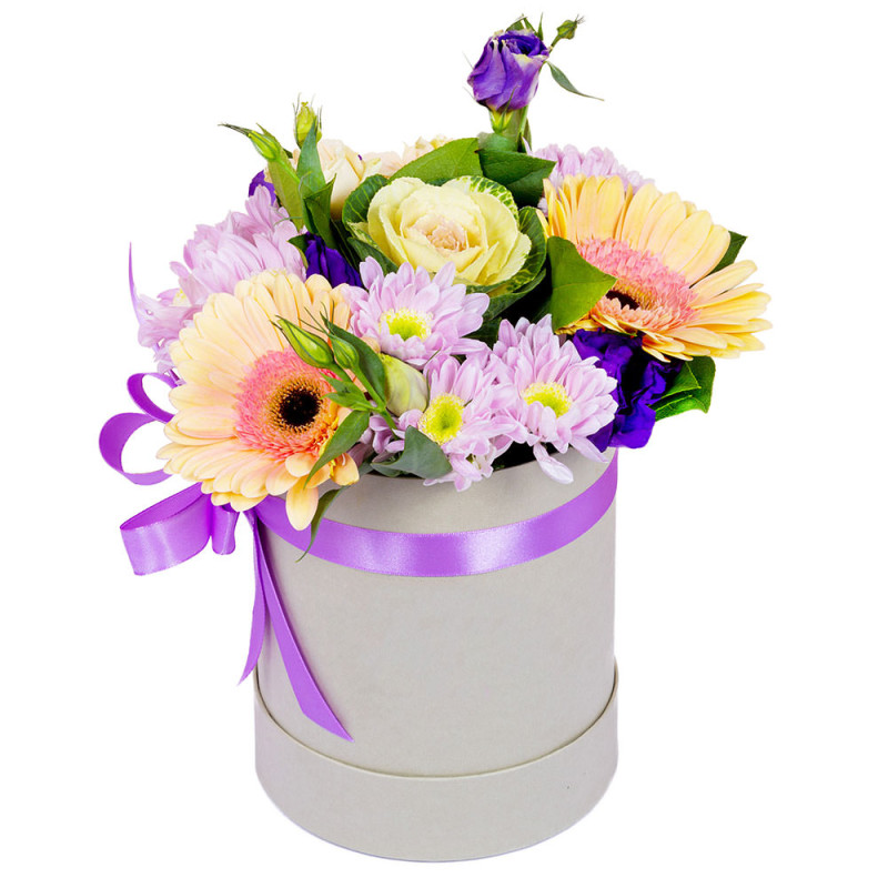 Эта композиция в пастельных тонах из кремовой герберы, сиреневой кустовой хризантемы, брасики и фиолетовой эустомы создаёт атмосферу лёгкости и нежности. Цветы аккуратно размещены в цилиндрической шляпной коробке, украшенной лавандовой атласной лентой. Такая цветочная композиция идеально подойдёт для подарка на День учителя для дорогого преподавателя, передавая тёплые и благодарные чувства.