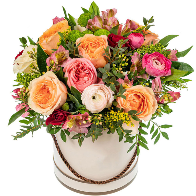 Этот букет излучает нежные и тёплые оттенки розового и персикового. В составе пионовидные розы, белый ранункулюс, кустовые розы, розовая альстромерия и зелёная хризантема. Композиция представлена в стильной шляпной коробке кремового цвета с изящной верёвочной ручкой. Она создаёт атмосферу утончённой элегантности, идеально подходящую для юбилея. Подарок порадует вашу тёщу.