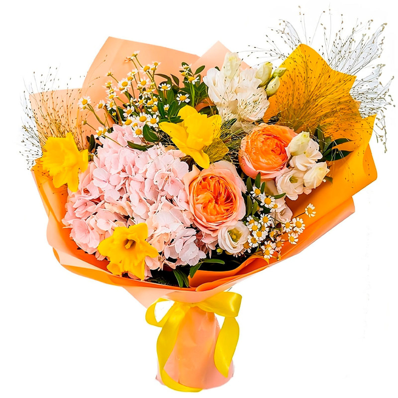 Этот букет поражает яркостью жёлтых нарциссов и нежностью розовой гортензии, создавая жизнерадостную атмосферу. В составе также присутствуют кустовая ромашка, оранжевая пионовидная роза, кремовая эустома и зелень. Упакован в матовую плёнку оранжевого цвета и украшен яркой жёлтой лентой. Идеально подходит для поздравления мамы на День матери.