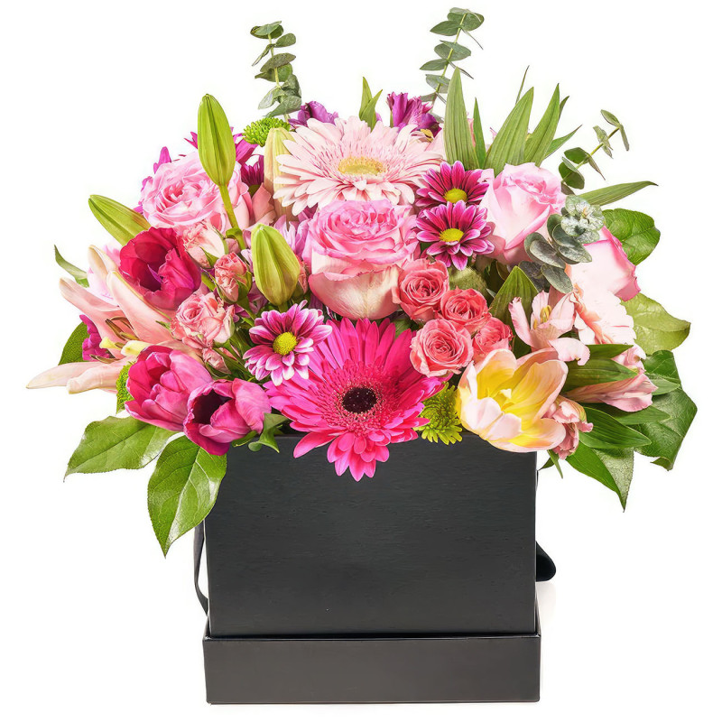 Яркие розовые оттенки бутона создают атмосферу радости и нежности. В составе букета: розовые герберы, розовые тюльпаны, розовые лилии, сиреневые и зелёные кустовые хризантемы, розовые кустовые розы, розовые одноголовые розы, розовая альстромерия, эвкалипт и зелень. Упакован в стильную квадратную коробку чёрного цвета, которая привлекает внимание и придаёт элегантности. Этот букет создаёт атмосферу утончённой романтики и идеально подойдёт для встречи из поездки, чтобы порадовать любимую женщину.