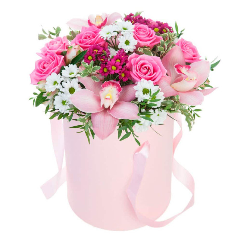 Этот букет поражает нежной палитрой розовых и белых оттенков. В композиции присутствуют розовая орхидея, одноголовая розовая роза, кустовая хризантема белая и розовая, а также фисташка. Цветы аккуратно собраны в шляпной коробке, украшенной розовой лентой. Эта композиция создает атмосферу утонченной элегантности, идеальна на золотую свадьбу для любимой женщины.