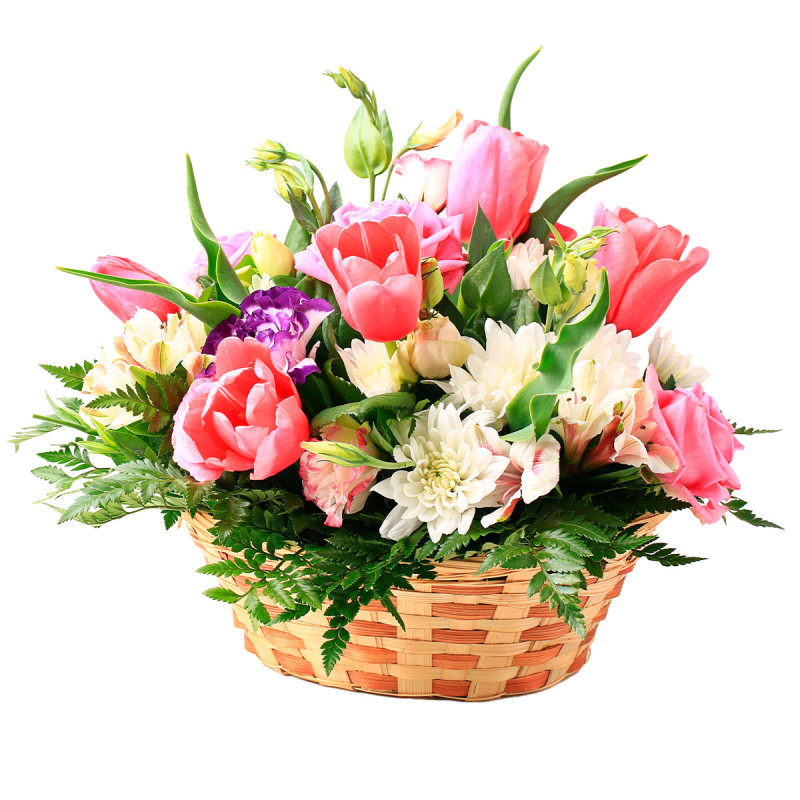 Этот букет из розовых тюльпанов, белых кустовых хризантем, белых альстромерий и фиолетовых гвоздик с зеленью создаёт радостное настроение. Цветы помещены в плетёную корзину, что добавляет композиции естественности и очарования. Атмосфера свежести и гармонии идеально подойдёт для романтического вечера или свидания. Прекрасный подарок для любимой женщины на День Святого Валентина.