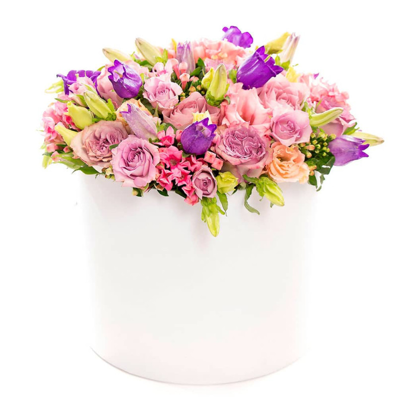 Нежная пастельная гамма букета создаёт атмосферу весеннего пробуждения. В состав входят бавардия, кампанула, сиреневые и розовые одноголовые розы, персиковая эустома и кустовые розы. Композиция оформлена в стильной белой шляпной коробке, придающей изделию элегантность и завершённость. Идеально подойдёт для благодарности учителю и станет чудесным подарком для тёти.