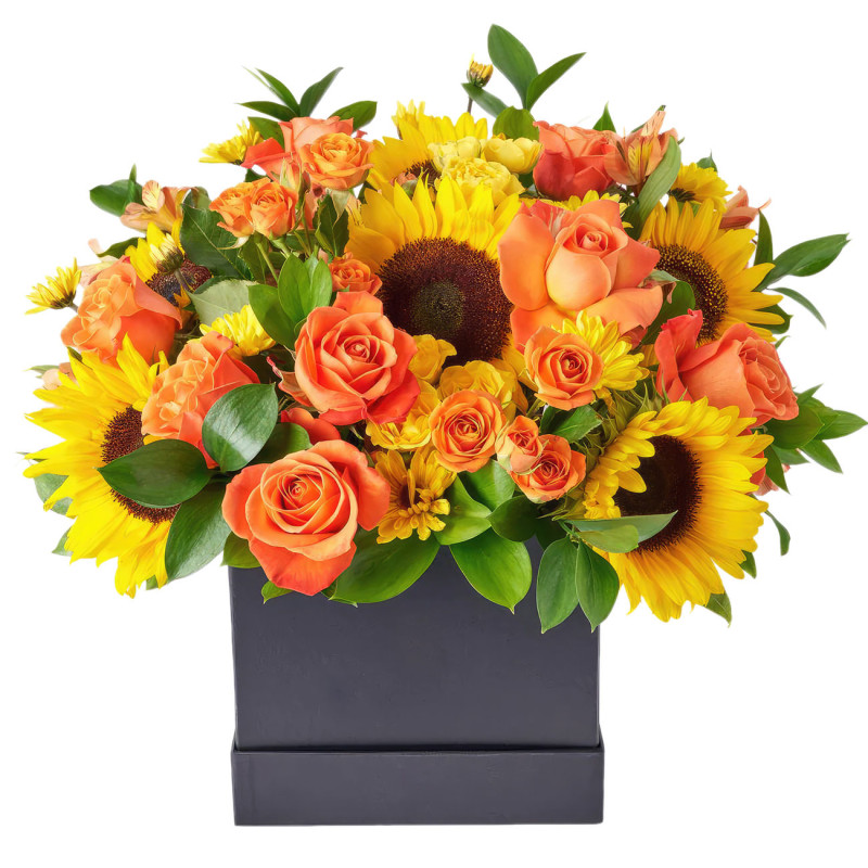 Яркие оранжевые и жёлтые оттенки создают атмосферу радости и тепла. В составе букета: подсолнухи, оранжевые кустовые розы, жёлтые хризантемы и оранжевая альстромерия. Композиция размещена в квадратной чёрной коробке, добавляющей стиль и контраст. Идеально подойдёт для встречи выпускников, чтобы порадовать своего друга.