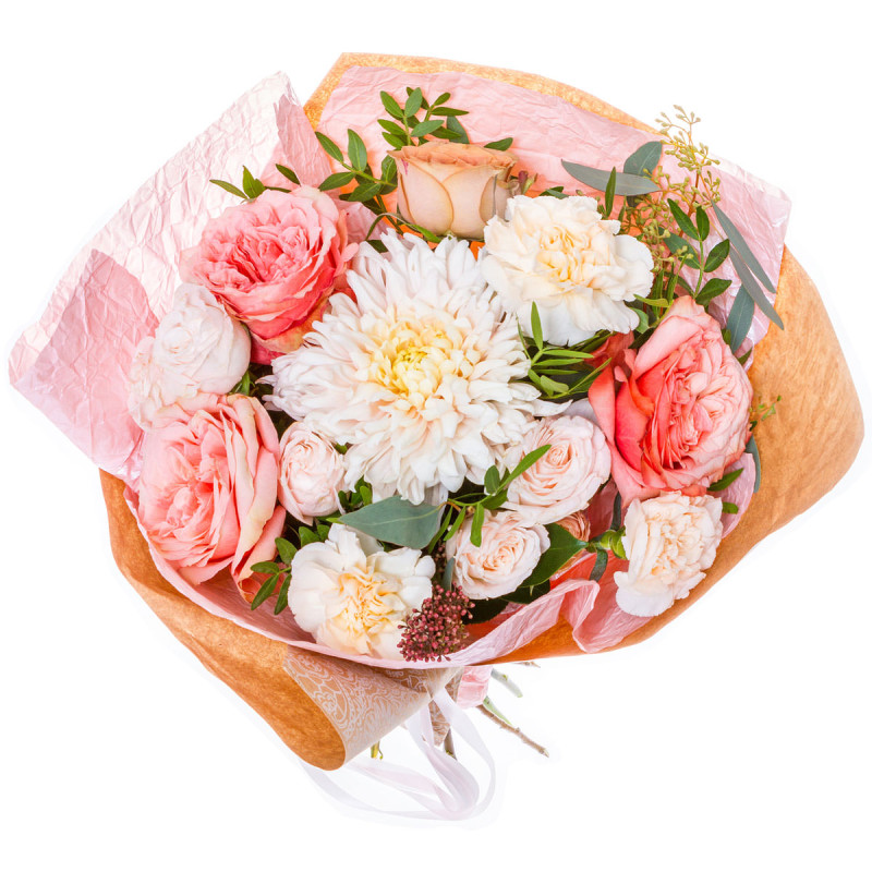 Нежные розовые оттенки создают атмосферу лёгкой романтики. В составе букета одноголовая розовая хризантема, розовая роза, кустовая розовая гвоздика и озотамнус, дополненные зеленью фисташки. Букет оформлен в крафт-бумагу и розовую матовую плёнку, перевязанную белой лентой. Эта композиция наполнит помещение уютом и теплом, идеально подойдет для поздравления коллеги на повышение.