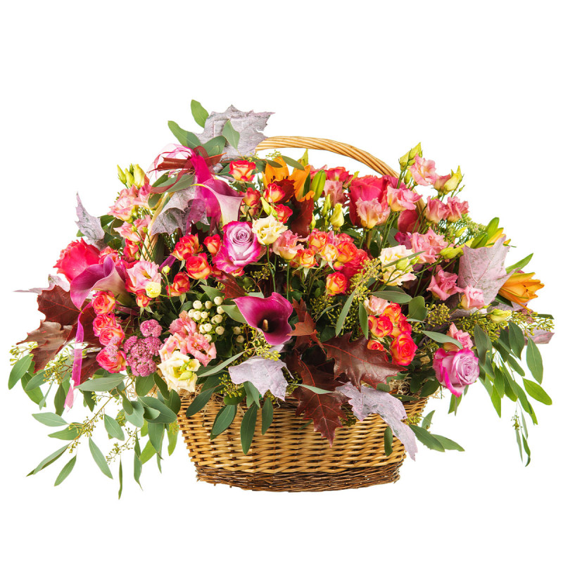 Эта яркая композиция из розовых и красных оттенков дарит ощущение радости и теплоты. В составе корзины розовая калла, красно-желтая кустовая роза, розовая эустома, кленовый лист, гиперикум и эвкалипт. Плетёная корзина подчеркивает естественную красоту цветов. Эта композиция создаст атмосферу праздника и станет прекрасным подарком для любимой женщины на День матери.