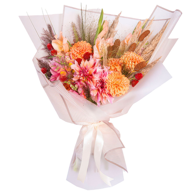 Яркие оранжевые и нежные розовые оттенки создают атмосферу радости и тепла. В составе букета: оранжевые и розовые георгины, персиковый гладиолус, львиный зев, дополненные сухоцветами. Букет оформлен в матовую плёнку с элегантной атласной лентой. Эта композиция создаёт уютную атмосферу и станет отличным подарком для любимой женщины на День Святого Валентина.