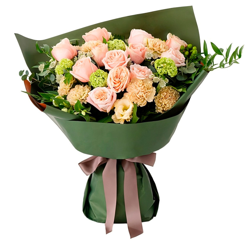 Нежные розовые и кремовые оттенки создают атмосферу весенней свежести. В составе букет состоит из пионовидных роз, кремовой эустомы, гиперикума, салала и эвкалипта, дополненных гвоздикой. Букет оформлен в матовую зелёную плёнку и перевязан атласной лентой. Такая композиция станет отличным подарком для любимой на свидание.