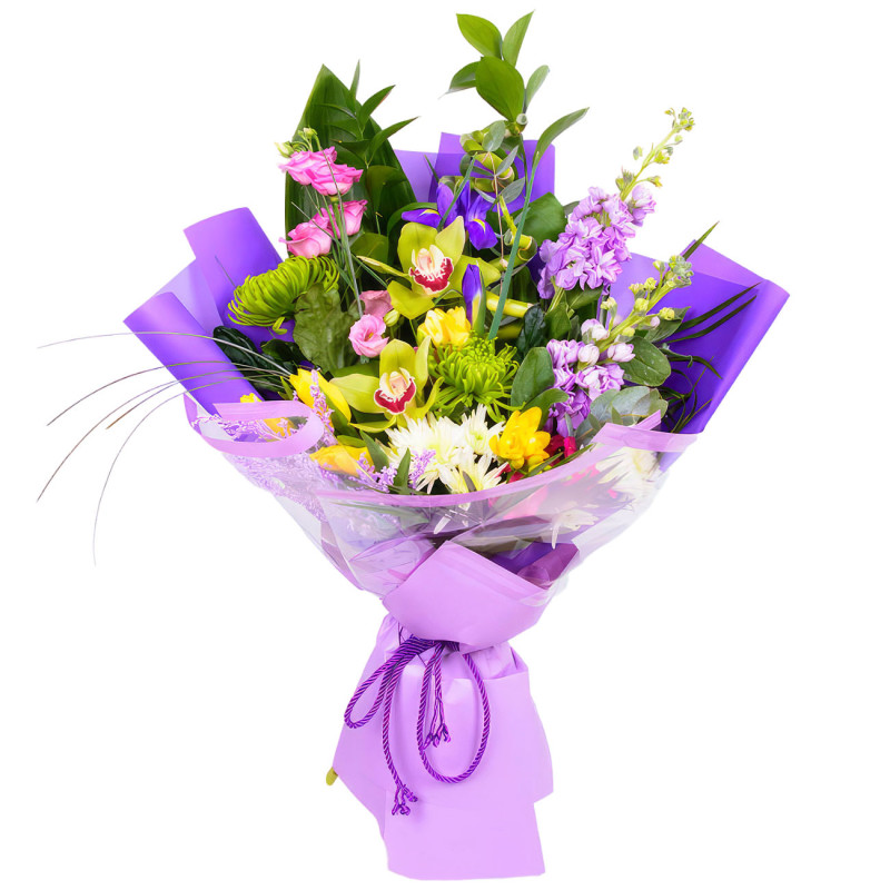 Этот букет создаёт атмосферу яркости и радости благодаря сочетанию жёлтых орхидей, розовой эустомы, сиреневой матиолы, светло-жёлтых хризантем и насыщенно-зелёной зелени. Упакован в фиолетовую матовую пленку с прозрачными вставками, дополненную декоративной фиолетовой лентой. Композиция прекрасно подойдёт для декора мероприятия и станет отличным подарком для любимого человека.