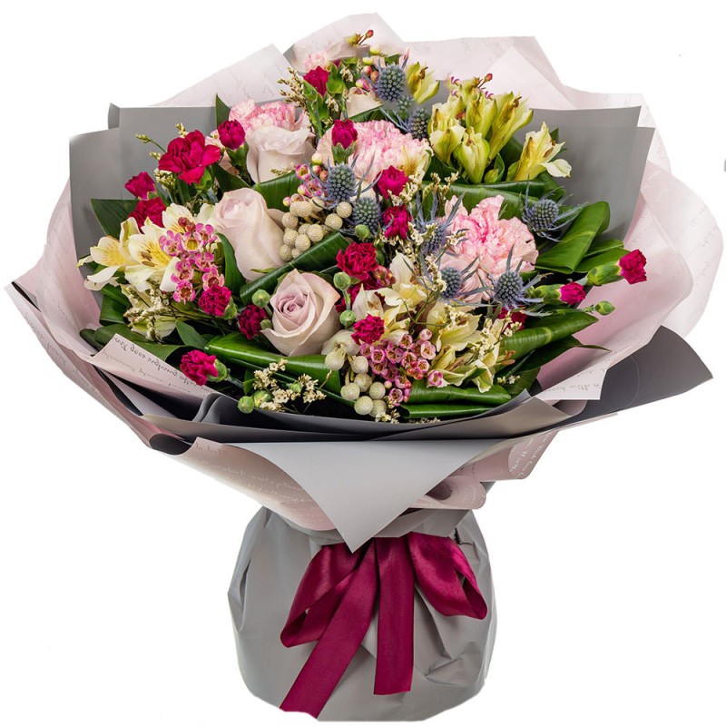 | Состав | Эрингиум, Розы, Гвоздики, Альстромерии, Лавандовые розы |