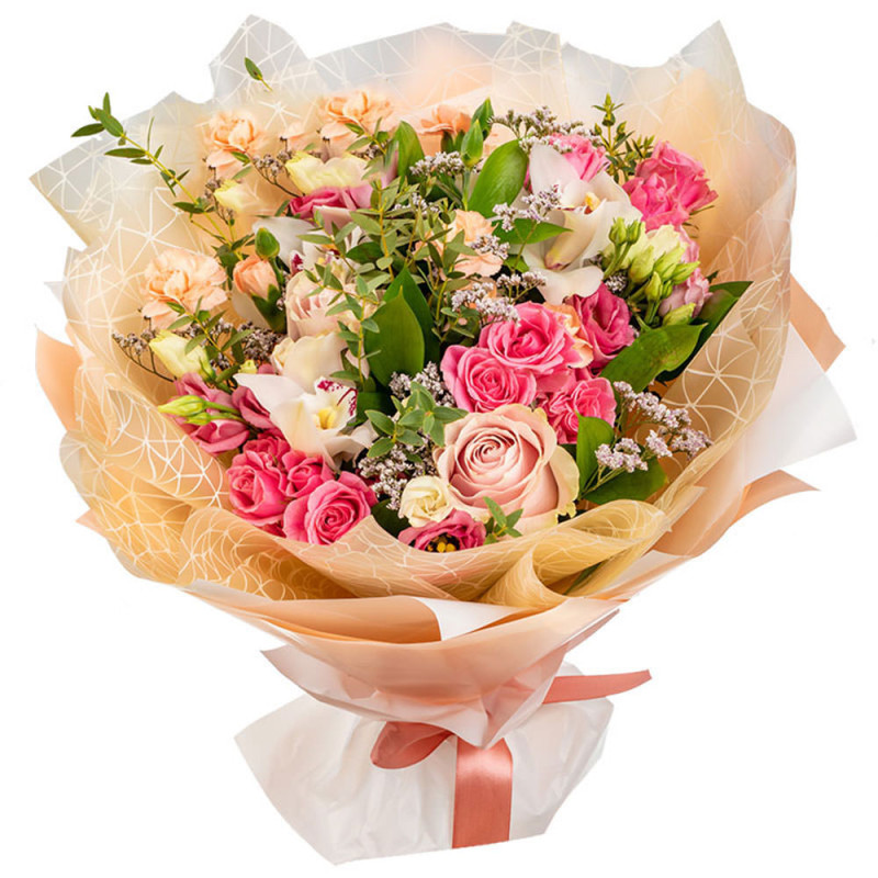 Этот букет очаровывает нежными оттенками розового и белого, создавая атмосферу радости и нежности. В его составе роза кустовая розовая, роза одноголовая светло-розовая, орхидея белая, фисташка и гипсофила. Упаковка выполнена из матовой плёнки с изящным рисунком и украшена лентой персикового цвета. Композиция создаёт атмосферу праздника и оптимизма. Подойдёт на День матери для любимой женщины.