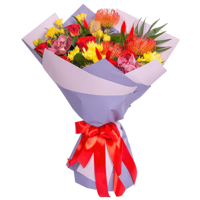 Яркие оттенки красного, желтого и розового создают в букете атмосферу радости и тепла. В его состав входят роза кустовая желтая и красная, хризантема кустовая желтая, лейкоспермум, орхидея розовая, роза «Эль Торо», аспидистра и чико. Композиция обернута в нежную матовую плёнку светло-сиреневого цвета и украшена ярко-красной атласной лентой. Такой букет подарит праздничное настроение на крестильную церемонию для любимой женщины.