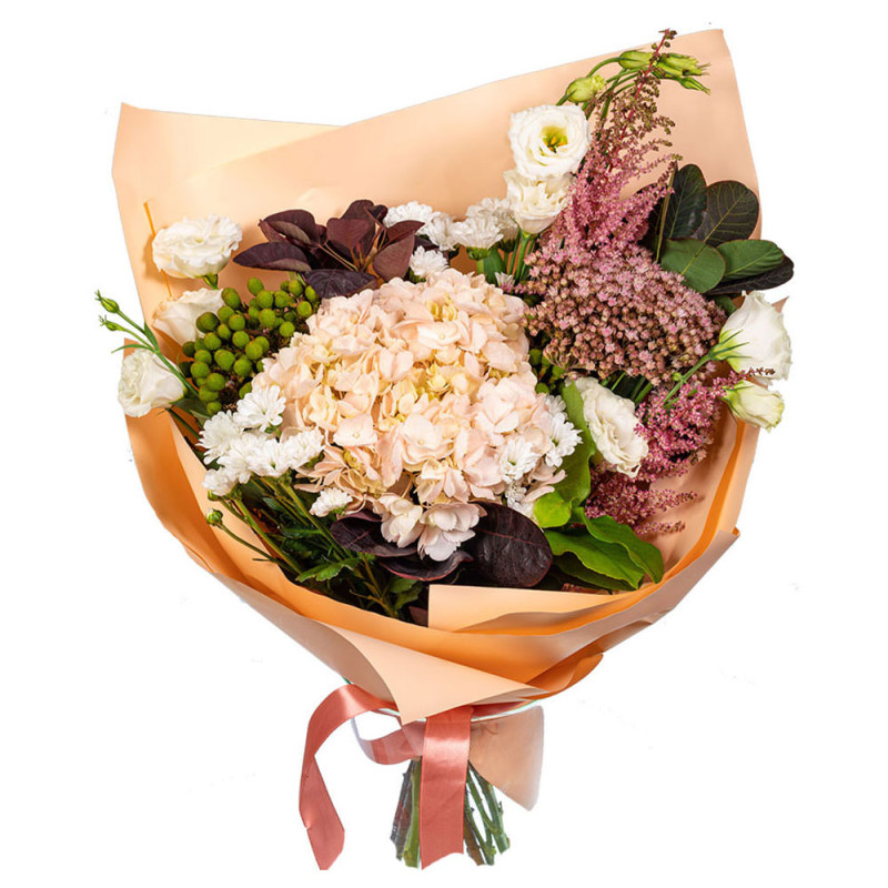 Этот букет в нежных пастельных тонах поражает своей изысканностью. В его составе кремовая гортензия, белая эустома, озотамнус, бруния и сочная зелень. Упакован в матовую пленку и крафт-бумагу, перевязанные атласной лентой теплого оттенка. Композиция создает атмосферу легкости и радости. Идеально подойдет для поздравления мамы на День матери.