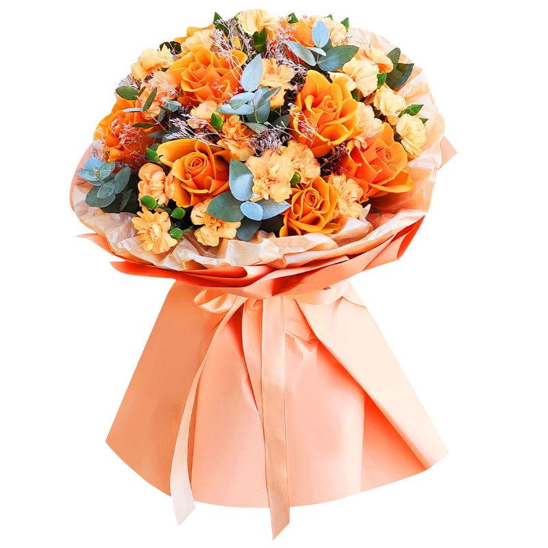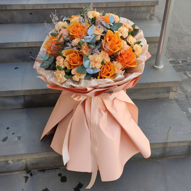 Эта яркая композиция в оранжевых тонах создаёт радостное настроение. В букете собраны оранжевые розы, каланхоэ и эвкалипт. Упакован в нежную матовую плёнку и завязан атласной лентой. Букет прекрасно украсит любое событие, создавая атмосферу тепла и уюта. Идеально подойдёт для вручения на открытие для начальства.