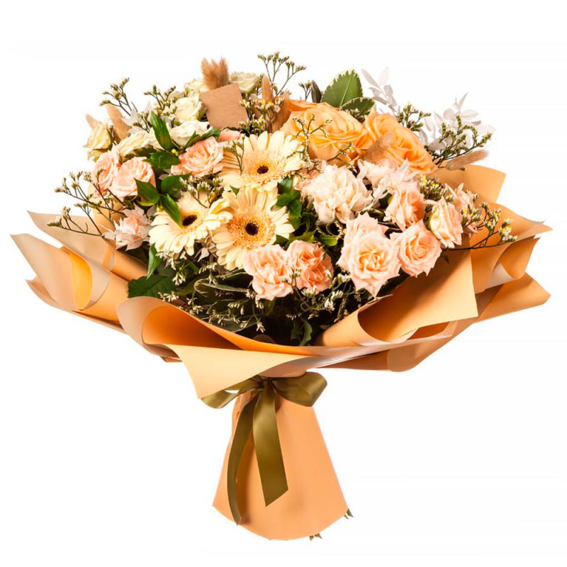 Очарование пастельных тонов поднимает настроение с первого взгляда. В букете изысканно собраны персиковая одноголовая роза, кремовая кустовая роза, кремовая гербера, вереск и зелень. Упаковка выполнена в матовой пленке и украшена элегантной атласной лентой. Эта композиция создает атмосферу нежности и романтики. Прекрасно подойдет для поздравления молодой мамы на выписку.
