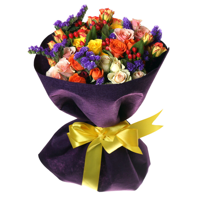 Эта композиция поражает гармоничным сочетанием оранжевых, розовых и кремовых оттенков. В букете собраны кустовые розы оранжевых, розовых и кремовых тонов, дополненные фиолетовой статицей и гиперикумом. Упакован в богатую фиолетовую ткань с яркой жёлтой лентой, создающей элегантный контраст. Букет создаёт атмосферу радости и уюта. Идеально подходит для поздравления коллеги на День учителя.