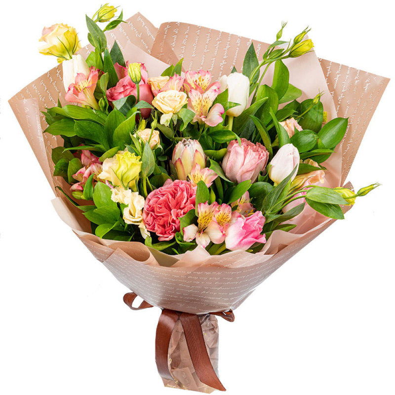 Яркие желтые эустомы и розовые альстромерии создают атмосферу свежести и нежности. В составе розовые пионовидные розы, светло-розовые тюльпаны и экзотическая протея. Упакован в матовую пленку и крафт-бумагу с изящным рисунком, перевязанную коричневой лентой. Композиция приносит радость и весеннее пробуждение. Отлично подойдет для поздравления на выпускной бал для молодожёнов.