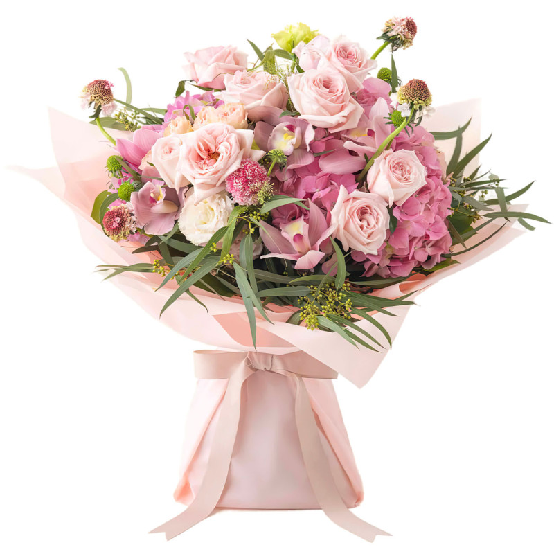 Элегантная палитра розовых оттенков создаёт атмосферу нежности и утончённости. В составе букета гортензия темно-розовая, роза кустовая розовая, орхидея розовая, эустома розовая и розовая скабиоза. Букет оформлен в нежно-розовую матовую плёнку и украшен лентой в тон. Эта композиция придаёт утонченность любому мероприятию, идеально подходя для празднования рубиновой свадьбы для любимой женщины.