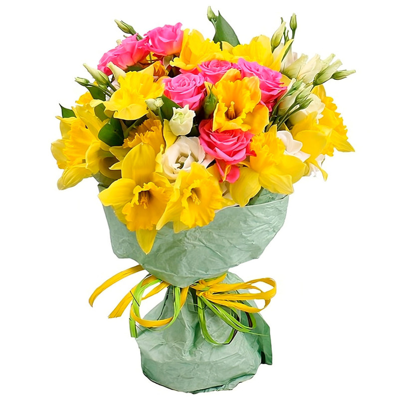 Яркие жёлтые нарциссы и нежные белые эустомы создают атмосферу весеннего тепла, дополняемые розовыми кустовыми розами. Букет оформлен в зелёную матовую бумагу с жёлтой декоративной лентой, что подчёркивает его природную свежесть. Композиция наполняет пространство радостью и светом, идеально подходя для вручения диплома. Этот букет станет прекрасным подарком для любимой женщины.