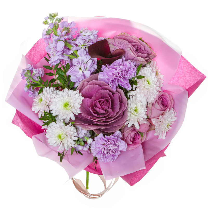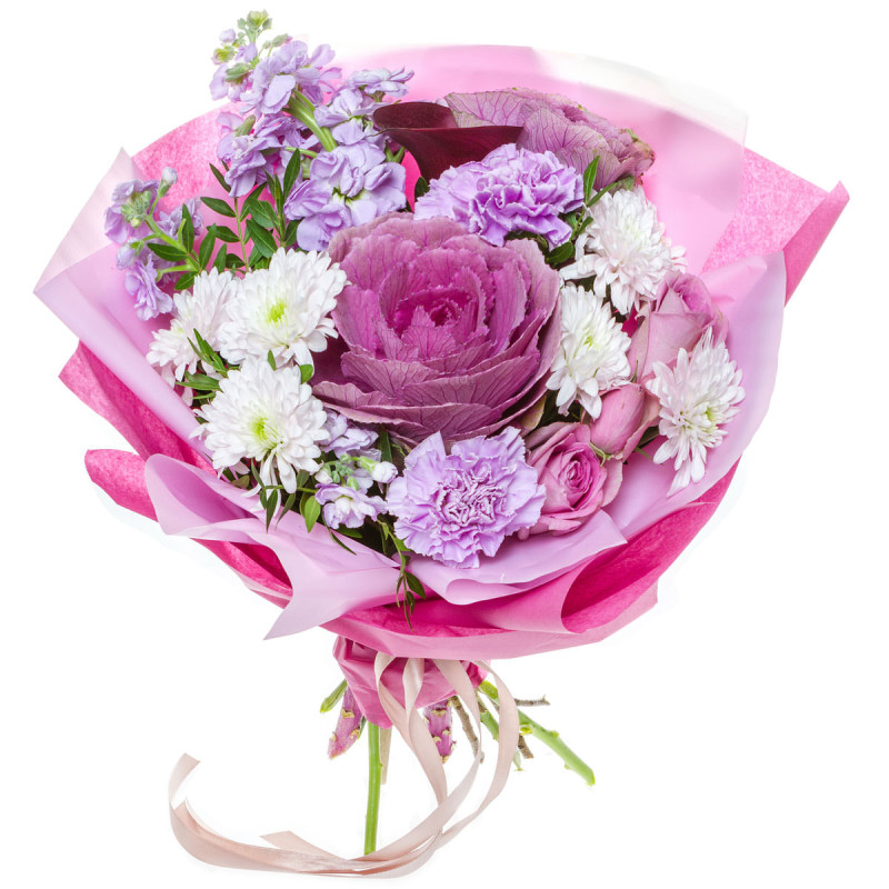 Этот букет в лилово-розовых тонах наполняет атмосферу нежностью и элегантностью. В составе букета маттиола сиреневая, брассика, фиолетовая гвоздика, белая кустовая хризантема и розовая одноголовая роза. Упакован в ярко-розовую матовую плёнку и украшен атласной лентой. Композиция создаёт романтическое настроение и станет отличным подарком для жены на годовщину.