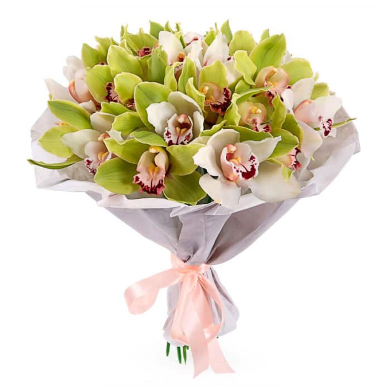 Этот букет поражает сочетанием жёлтых и белых орхидей, создавая атмосферу утончённой элегантности. Цветы аккуратно упакованы в матовую плёнку, перевязанную нежной атласной лентой розового цвета. Композиция приносит ощущение свежести и гармонии. Прекрасный выбор для поздравления любимой на годовщину.